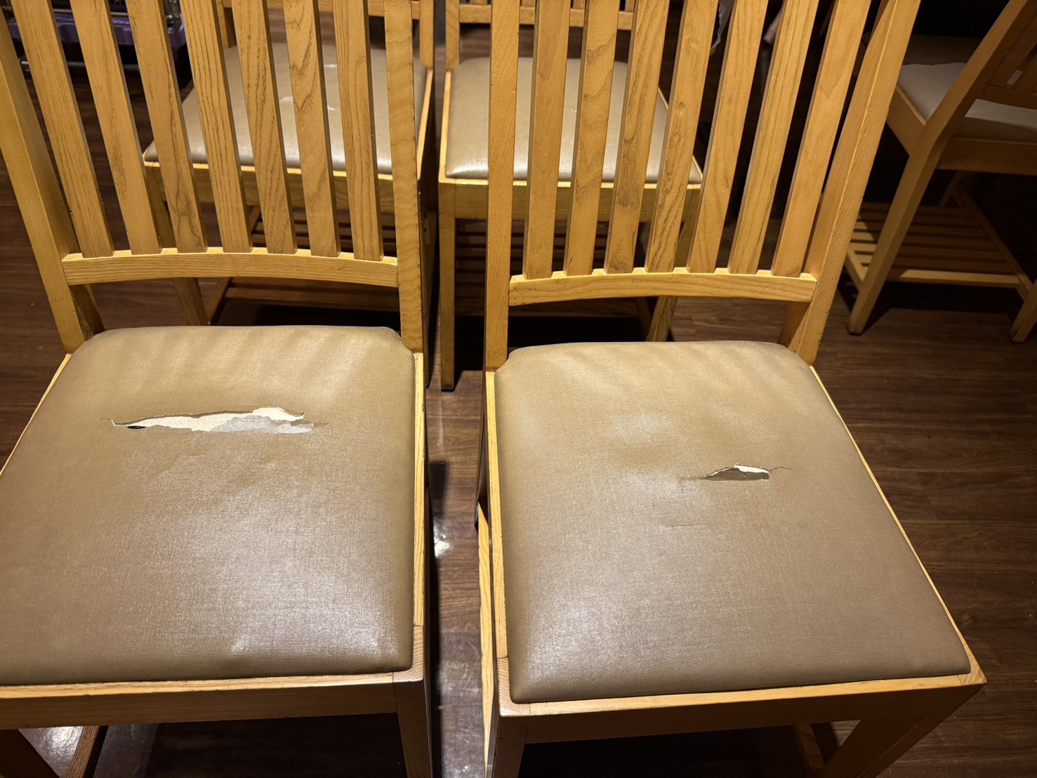 今回も営業前の2時間で6脚の椅子を張り替えました。