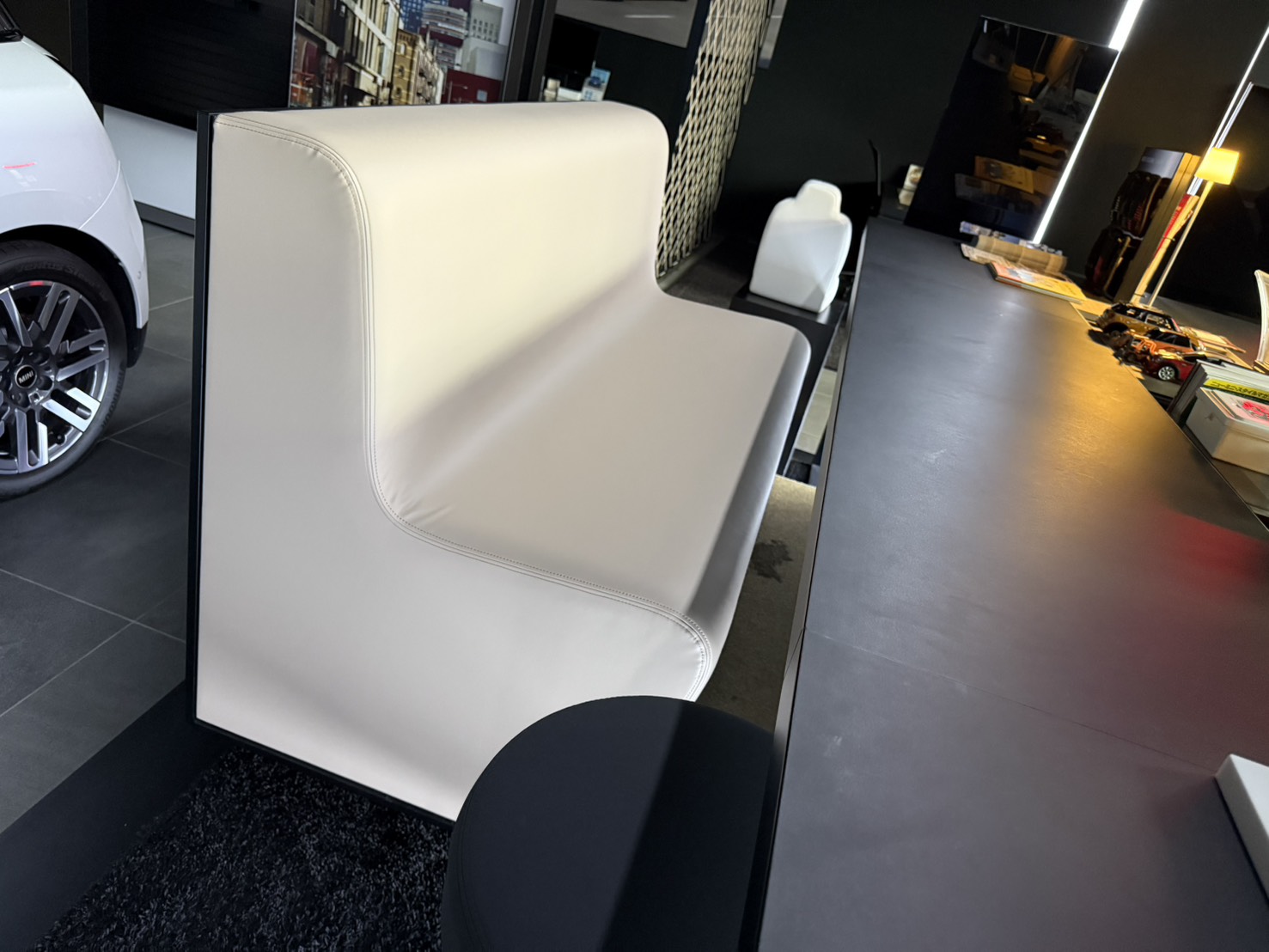 本日は双日オートグループ様からのご依頼でMINI城東鶴見店様のお客様用のソファーの張り替えです。