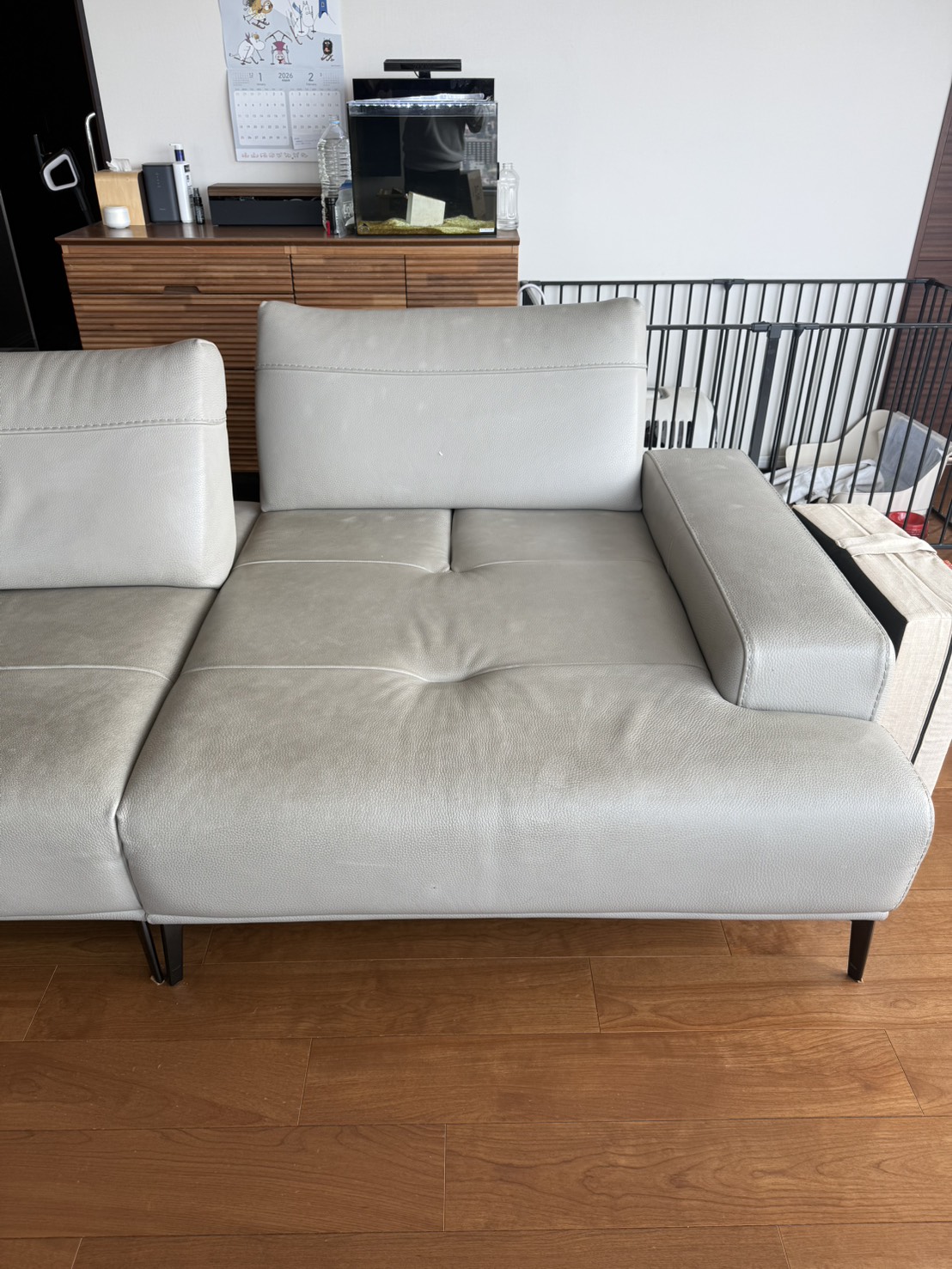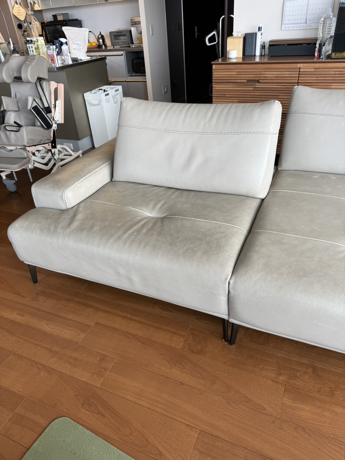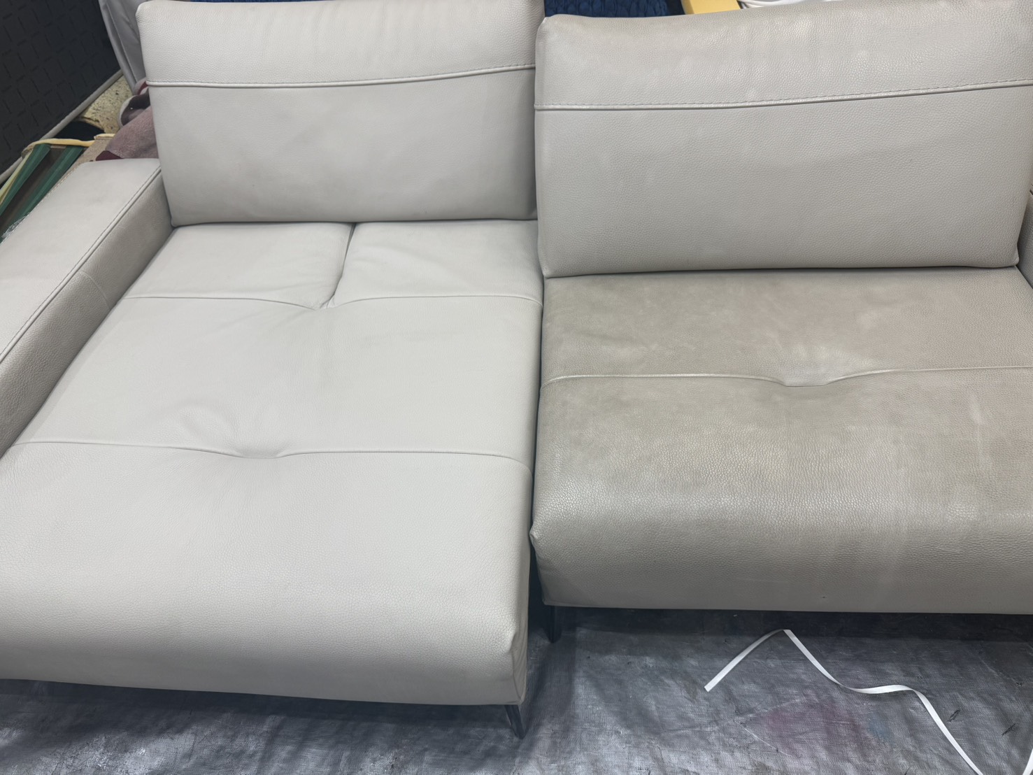 薄いグレーの革なので汚れが目立ちます。画像ではわかりにくいのですが半分だけ施工した画像がこちら!!